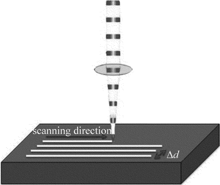 實驗方法如圖 2所示。將1.5mm厚CFRP板置于激光焦平面上,分別研究平均功率、掃描速率、重復頻率、掃描次數對熱影響區及掃描深度的影響。為了更加均勻地去除整個碳纖維復合材料和提高去除效率,對軌跡進行多次循環掃描,并通過動態聚焦系統實現焦點補償。在切割中為了避免切縫過窄造成的遮蔽效應,掃描若干條間距為Δd的平行軌跡來增加切縫寬度,最終實現1.5mm厚CFRP切割。