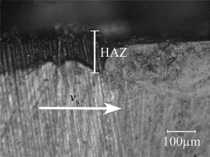 在激光功率為60W、重復頻率為0.4MHz、掃描速率為1m/s時,CFRP表面熱影響區如圖 4所示。從圖中可以看出,CFRP表層纖維的排布方式對熱影區有顯著影響,當掃描方向與表層纖維排布方向垂直時,熱影響區達70μm;當掃描方向與纖維排布方向一致時,材料表面幾乎沒有熱影區。主要是因為碳纖維的熱傳導率遠遠大于環氧樹脂的熱傳導率,未能達到CFRP燒蝕閾值處的脈沖能量沿著碳纖維方向傳播,所以當掃描方向與表層纖維排布方向一致時,沿著掃描方向傳播的能量與下一個脈沖能量共同用于去除CFRP材料,掃描深度也更大,對切縫兩側造成熱影響區較??;而當掃描方向與表層纖維排布方向垂直時,能量沿著掃描垂直方向傳播,切縫兩側熱量累積,對CFRP造成熱損傷,導致嚴重的熱影響區。